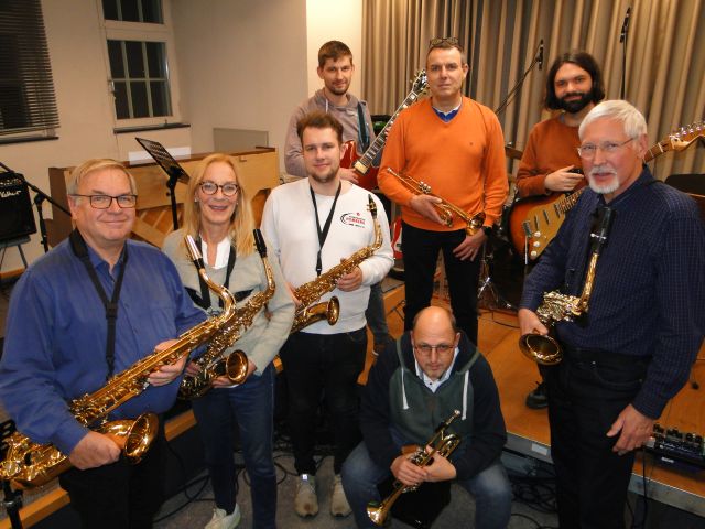 Der harte Kern: Im neuen „Large Ensemble“ haben sich Mitglieder der ehemaligen „Brick Town Big Band“ zusammengefunden, um mit neuen Musikern unter der Leitung von David Krüger ein musikalisches Experiment zu wagen. Von links: Rolf Kehde, Moni Schmidt, Thilo Wesseler, Marcel Schmidt, Ralf Hürtgen, David Krüger und Rolf Hausdörfer. Im Vordergrund kniet Winfried Emmerich. Foto: Hajo Gärtner